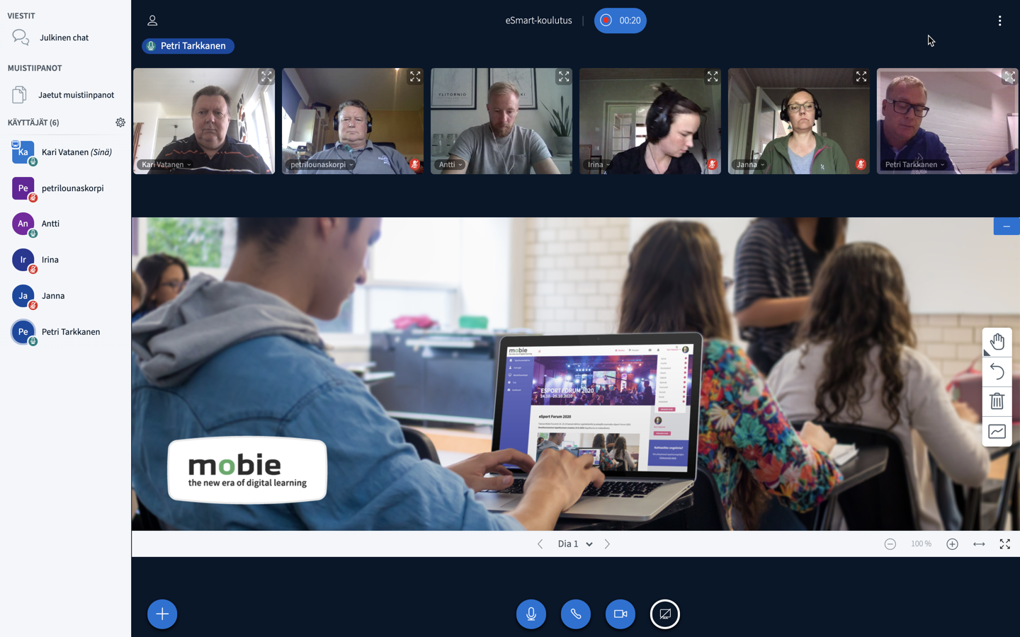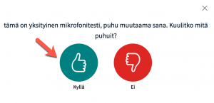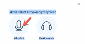 Videoneuvottelutilan avautuessa sinun tulee antaa järjestelmälle oikeudet käyttämäsi laitteen mikrofonille ja äänilähteelle. Vastaa ensin kysymykseen “Miten haluat liittyä ääniyhteyteen? > Mikrofoni”, jonka jälkeen palvelu testaa mikrofonin toiminnan. Vastaa “Kyllä” jos kuulet testin aikana oman puheesi. Pääset liittymään palveluun testin jälkeen.