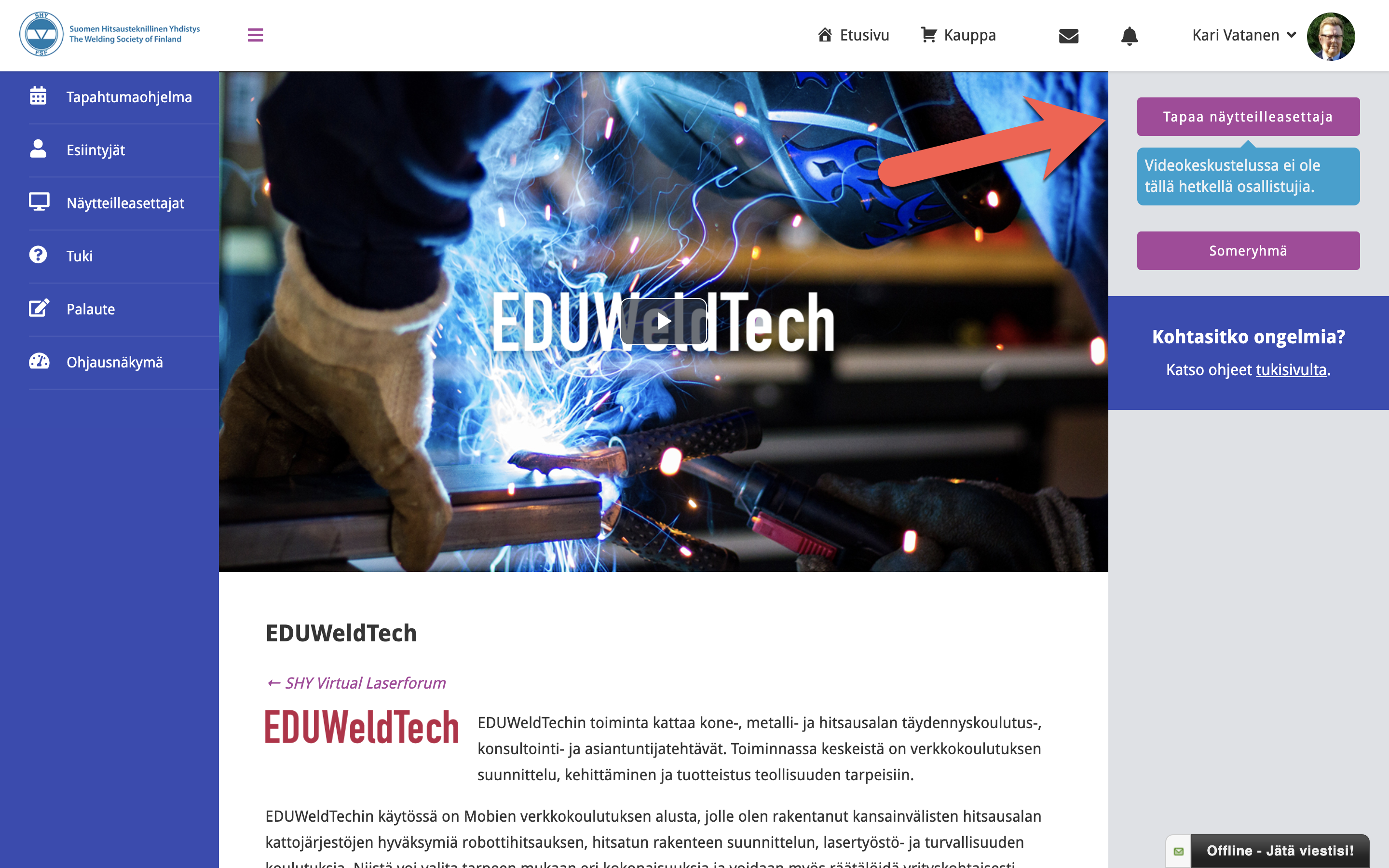 Jokaisella esiintyjällä on oma henkilökontainen videoneuvottelutila ryhmätyöhuoneineen. Siirry esitystilasta puhujan tai näytteilleasettajan videoneuvottelutilaan klikkaamalla sivun oikeassa ylälaidassa olevaa “Liity videokeskusteluun” tai “Tapaa näytteilleasettaja” -painiketta. Näet painikkeen alapuolelta kuinka monta henkilöä on parhaillaan mukana keskustelussa.